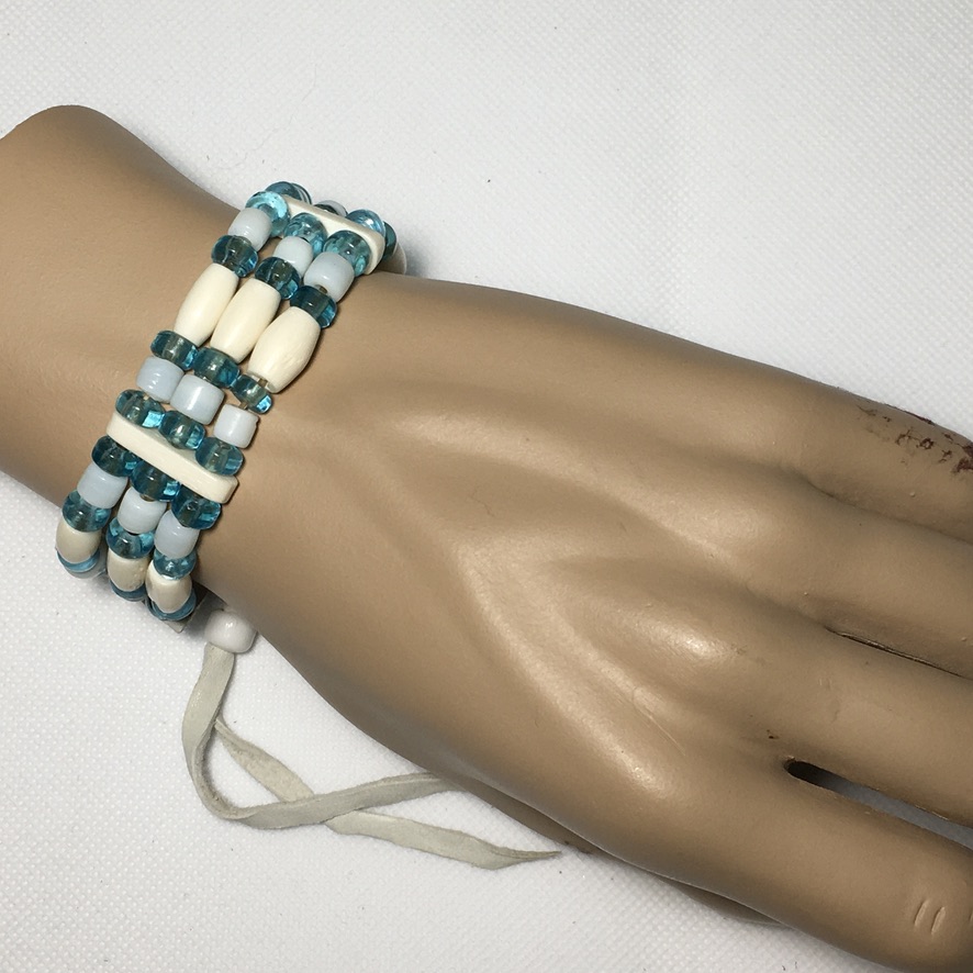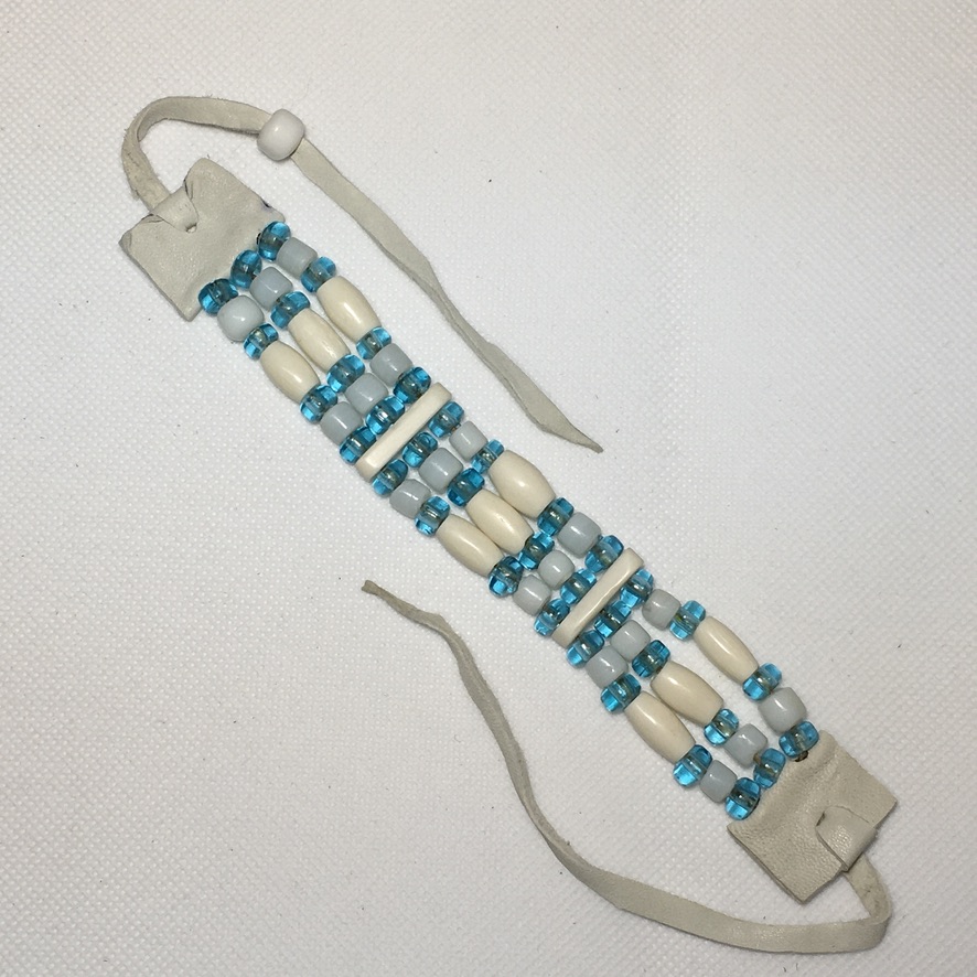 Three strand bone bracelet/choker made with horn & glass beads (sky blue and white). Spacers are bone. Measures approximately 5.25″ in length. Adjustable leather ties are an additional 4.5″ each in length.