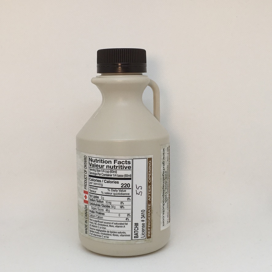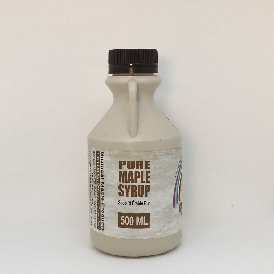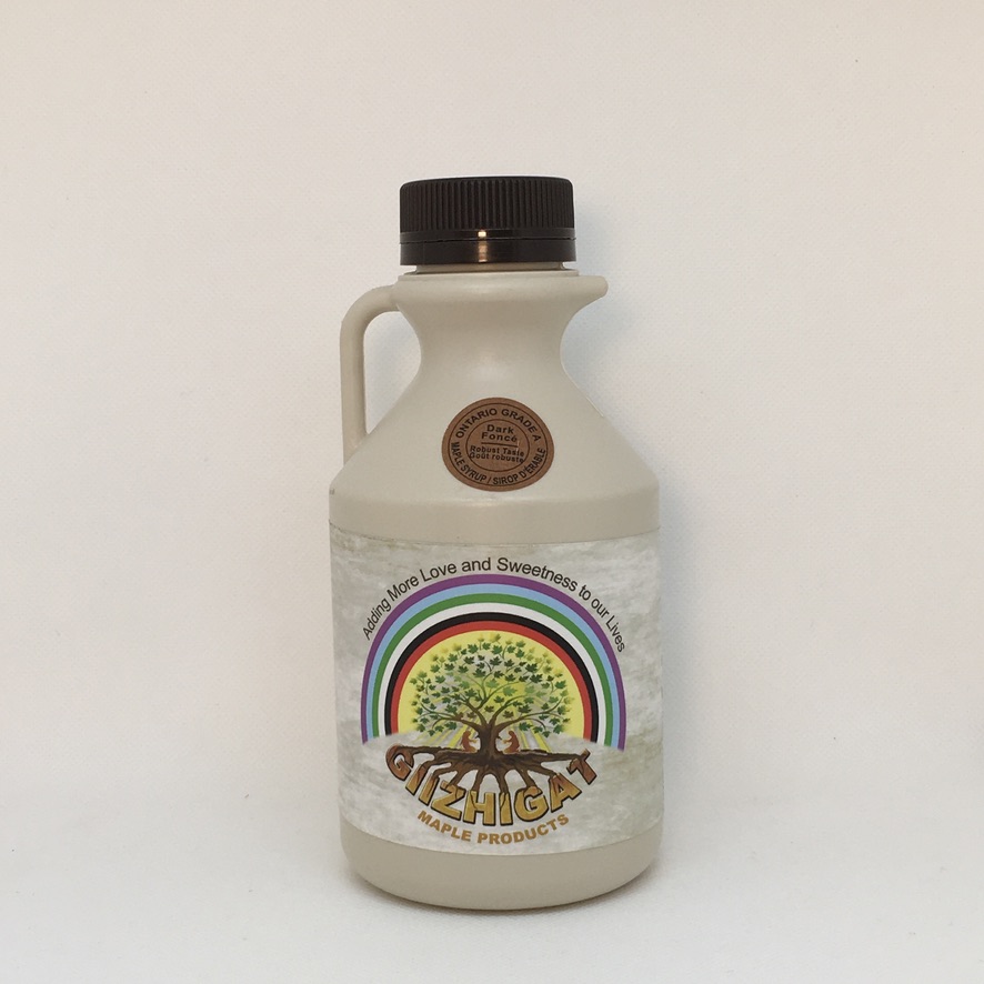 Giizhigat Maple Syrup is packaged in a recycleable plastic jug