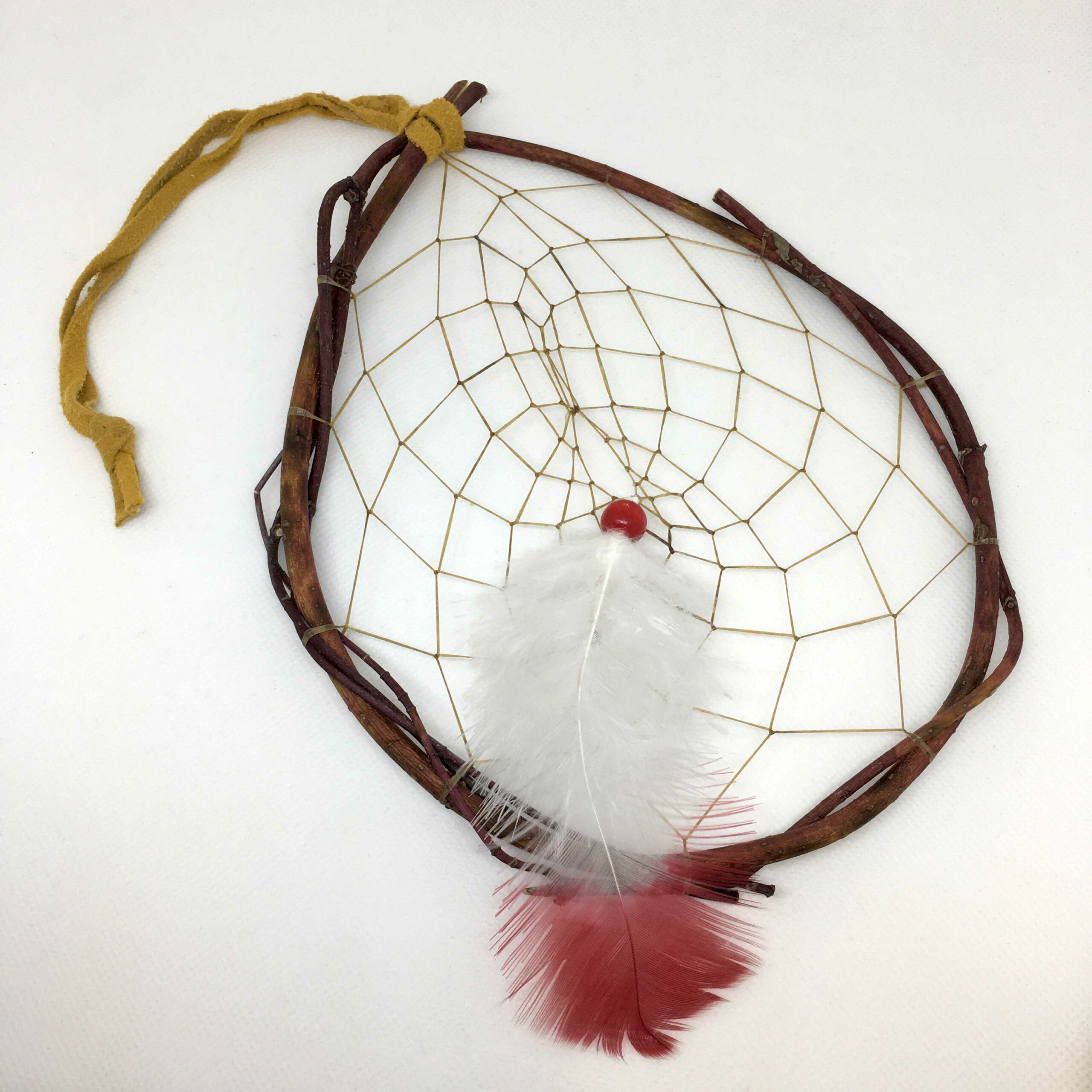 Authentically crafted with hand-picked red willow. Measures approximately 7.75″ in length x 6″ width. Artificial sinew is used for weaving. Feather is maribou, white with red tip, approximately 4.75″ long.