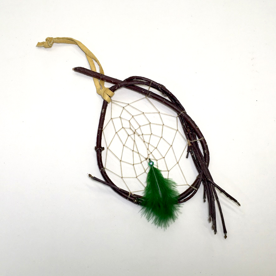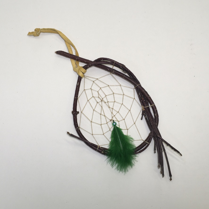 Authentically crafted with hand-picked red willow. Measures approximately 6″ in length x 4.5″ in width. Artificial sinew is used for weaving. Feather is artificial, green, approximately 2.5″ long.