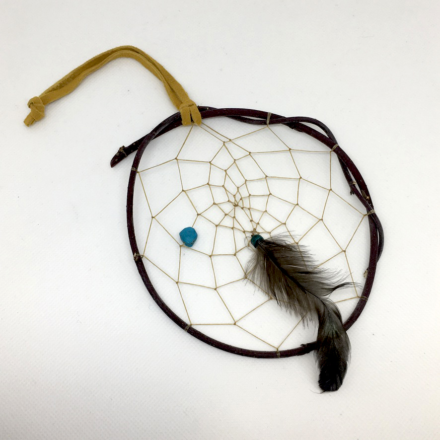 Authentically crafted with hand-picked red willow. Measures approximately 5″ in length x 4.5″ in width. Stone in webbing is turquoise. Artificial sinew is used for weaving. Feather is wild turkey, approximately 3.5″ long.