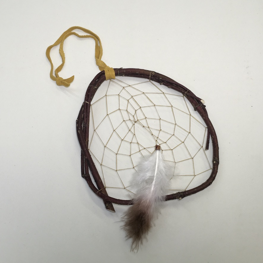 Authentically crafted with hand-picked red willow. Measures approximately 6.5″ in length x 7″ in width. Artificial sinew is used for weaving. Feather is artificial, white with brown tip, approximately 4.5″ long.